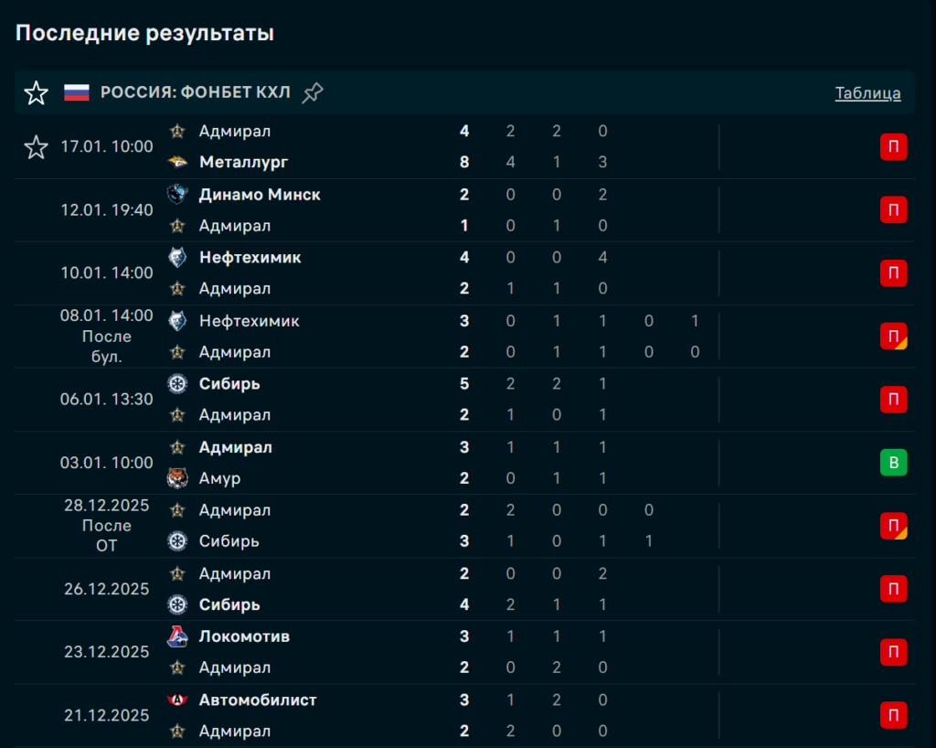 19 января, 12:30 МСК, «Фетисов Арена», Владивосток. Регулярный чемпионат КХЛ, 47-й игровой день. «Адмирал» занимает 11-е место на Востоке с 34 очками в 43 матчах, отставая от зоны плей-офф. «Ак Барс» — второй с 62 очками в 46 играх. Хозяева проиграли пять матчей подряд, включая крупное поражение от «Металлурга» (4:8). Гости выиграли три из последних четырёх встреч, в том числе уверенно обыграв «Амур» (5:3) и «Автомобилист» (5:0). У «Адмирала» четыре травмированных игрока, у «Ак Барса» — минимальные потери.