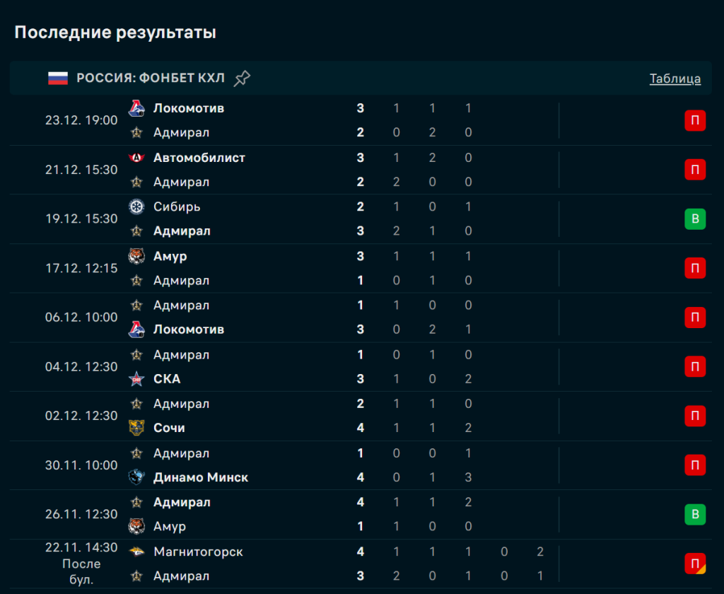 Победа над «Сибирью» (3:2), поражения от «Автомобилиста» (2:3) и «Локомотива» (2:3), до этого — крупные проигрыши «Амуру» (1:3), СКА (1:3) и «Локомотиву» (1:3). В шести последних матчах «Адмирал» завершил пять со счётом 3:2 или 3:1, что подтверждает стабильность в защите и способность держать игру в узком диапазоне.