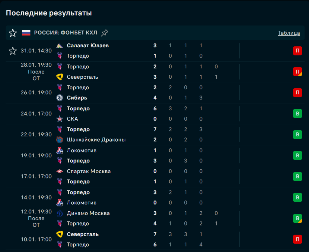 После ярких 6 : 0 со СКА и 7 : 2 с «Шанхайскими Драконами» команда споткнулась: 2 : 4 с «Сибирью», 2 : 3 ОТ с «Северсталью», 1 : 3 в Уфе. Однако даже в неудачных матчах «Торпедо» создавало достаточно для очков, а на выезде структура обычно плотнее, чем дома.