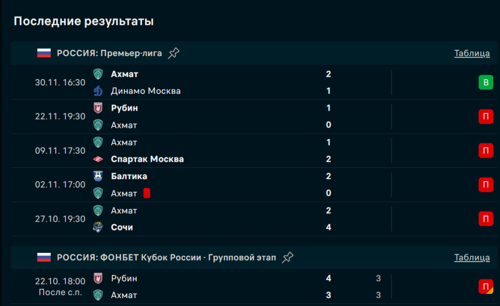 Последние игры команды Ахмат