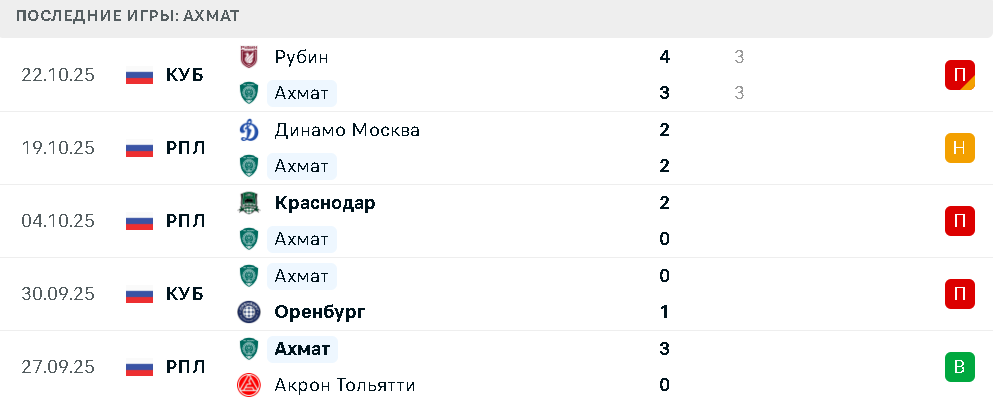В пяти последних матчах в разных турнирах Ахмат одержал только одну победу в основное время над Акроном. После этого были ничьи с Динамо Москва и Рубином, а также поражения от Оренбурга и Краснодара.