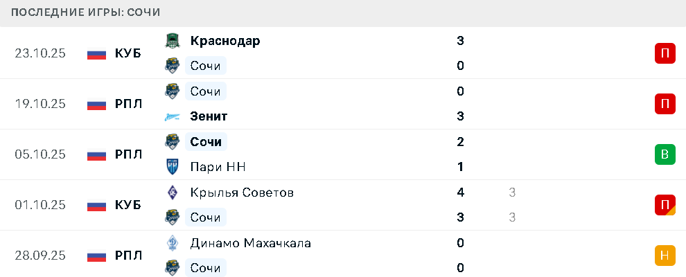 В пяти предыдущих матчах в разных турнирах сочинцы одержали одну победу над Пари НН. Кроме этого были ничьи в основное время с махачкалинским Динамо и Крыльями Советов, а также поражения от Зенита и Краснодара.