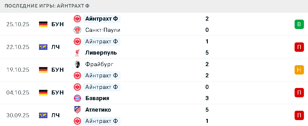 В пяти последних матчах в разных турнирах Айнтрахт потерпел три поражения от Атлетико, Баварии и Ливерпуля. Также была ничья с Фрайбургом и победа над Санкт-Паули.