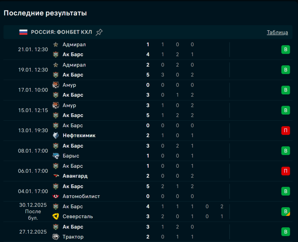 24 января, 17:00 МСК, «Татнефть Арена», Казань. Регулярный чемпионат КХЛ, 49-й игровой день. «Ак Барс» занимает 2-е место на Востоке с 68 очками в 49 матчах, демонстрируя лучшую разницу шайб в конференции (+33). «Сибирь» — 8-я с 41 очком в 48 играх и худшей обороной среди плей-офферов (154 пропущенные шайбы). Хозяева выиграли четыре из пяти последних матчей, включая победы над «Амуром» (5:0, 3:0) и «Адмиралом» (5:2, 4:1). Гости проиграли три из пяти последних встреч, в том числе «Автомобилисту» (0:2) и «Нефтехимику» (1:3). Для казанцев — борьба за домашнее преимущество, для новосибирцев — отчаянная попытка удержаться в зоне плей-офф.
