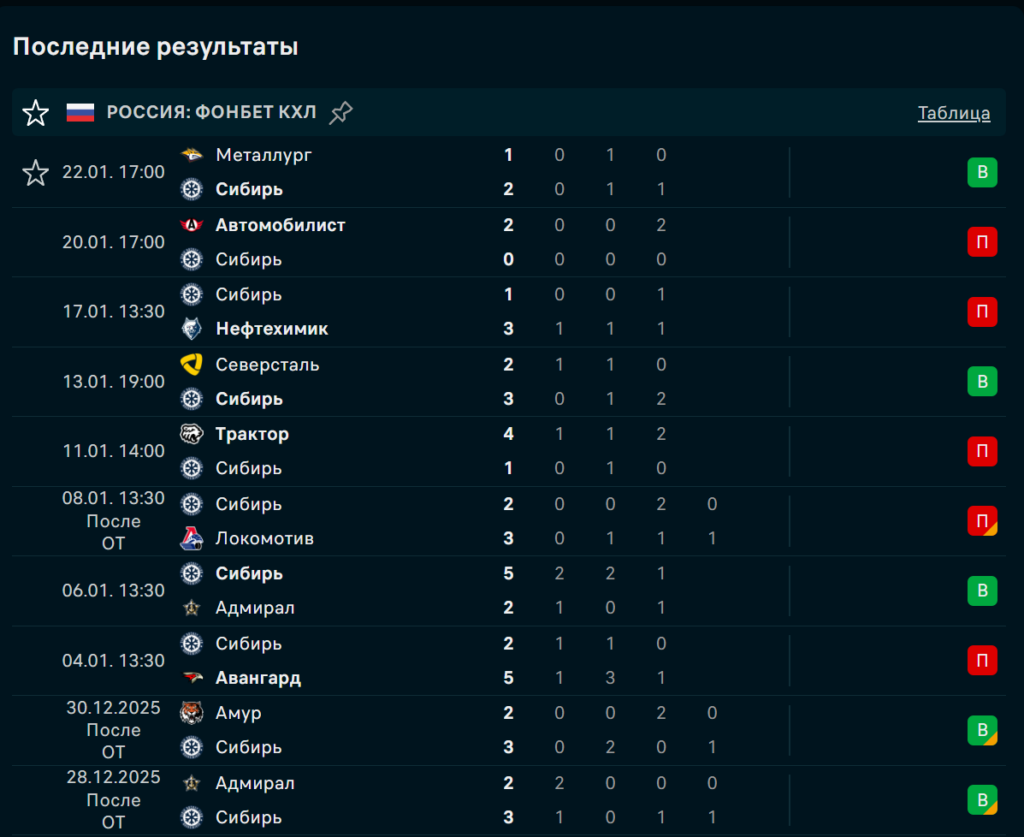 «Сибирь» уступила «Автомобилисту» (0:2), «Нефтехимику» (1:3) и «Трактору» (1:4), прервав серию лишь победами над «Металлургом» (2:1) и «Северсталью» (3:2). Команда регулярно проигрывает в ключевых эпизодах и не справляется с давлением в третьих периодах.