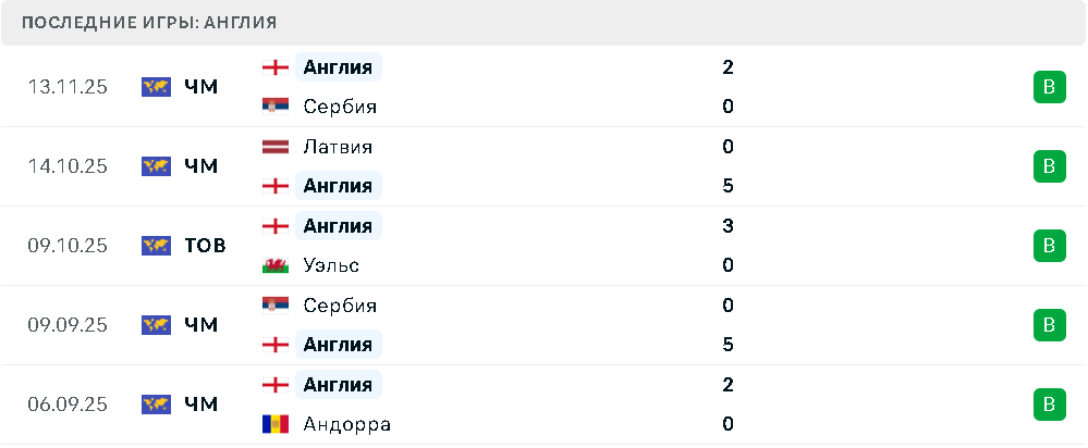 Помимо побед в отборочных матчах над Андоррой, Сербией (дважды) и Латвией, сборная Англии успела сыграть один товарищеский матч, в котором взяла верх над Уэльсом.
