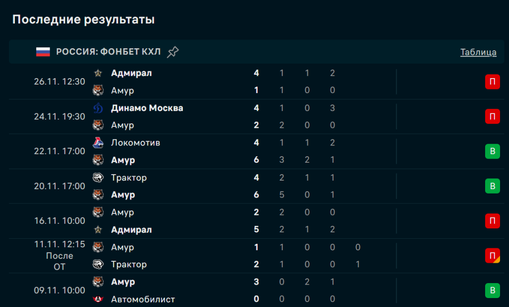 В последних пяти матчах «Амур» выиграл дважды и трижды проиграл. Победы были одержаны на выезде — над «Локомотивом» (6:4) и «Трактором» (6:4), где команда продемонстрировала взрывную результативность. Однако дома последовала серия провалов: поражения от «Динамо» Москвы, «Адмирала» и «Сочи» при минимальной результативности. Особенно тревожит игра в обороне — в трёх домашних матчах подряд пропущено 9 шайб, включая голы при численном преимуществе соперника.