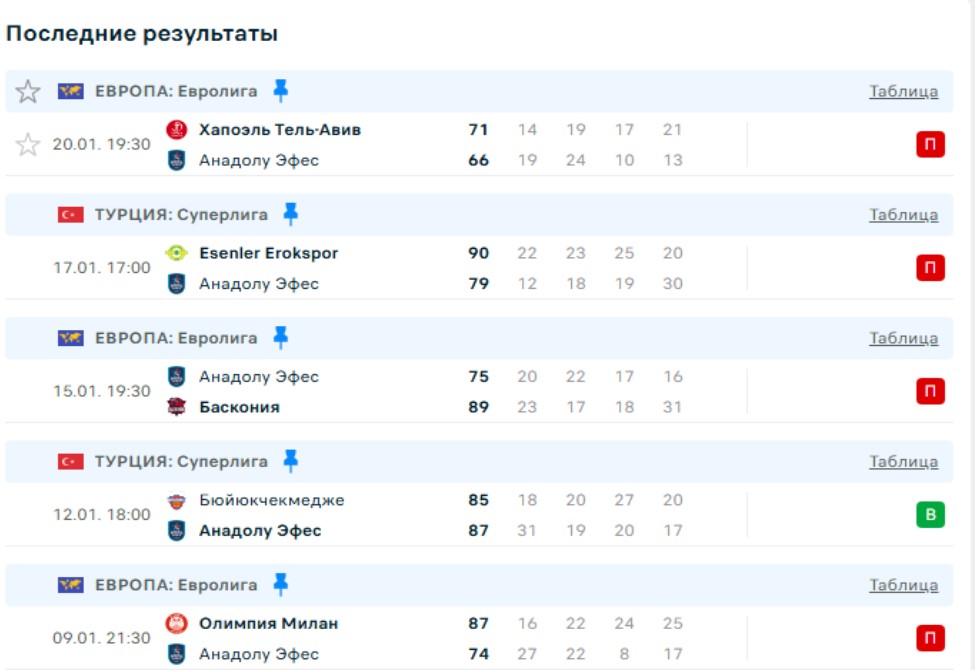 Последние игры Анадолу Эфес