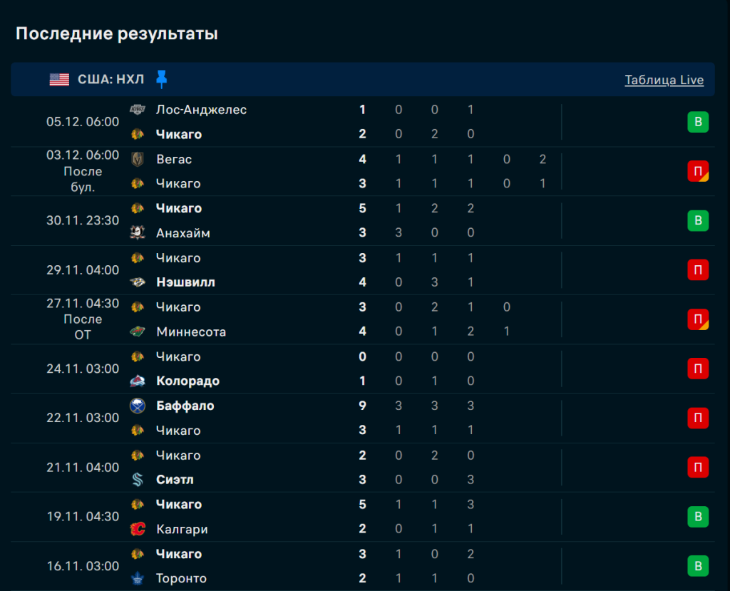 «Чикаго» нестабилен, но опасен на выезде: 4 победы в 7 гостевых матчах. Команда выигрывает за счёт эффективности в завершении при умеренном xG (2,75 за игру). Однако оборона регулярно проваливается: шесть пропущенных от «Лос-Анджелеса» — не единичный случай. Найт, сыгравший накануне, может быть заменён на Сёдерблума. Бедард остаётся главной ударной силой — 29 очков в сезоне.