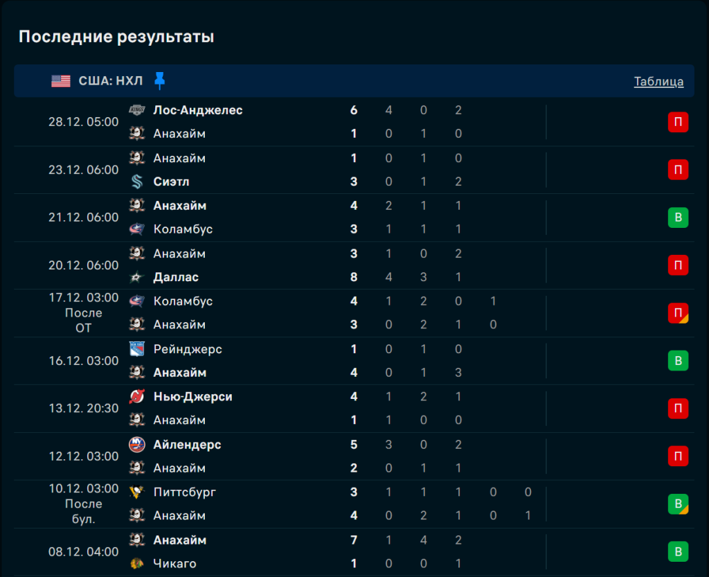 25 октября 2025: «Анахайм» — «Тампа» (3:4), 17 января 2025: «Анахайм» — «Тампа» (3:3, победа по буллитам). В четырёх из последних пяти очных матчей заброшено минимум 6 шайб. Средний тотал — 6,2 шайбы. «Тампа» выиграла 3 из 5, но все встречи были напряжёнными и результативными.