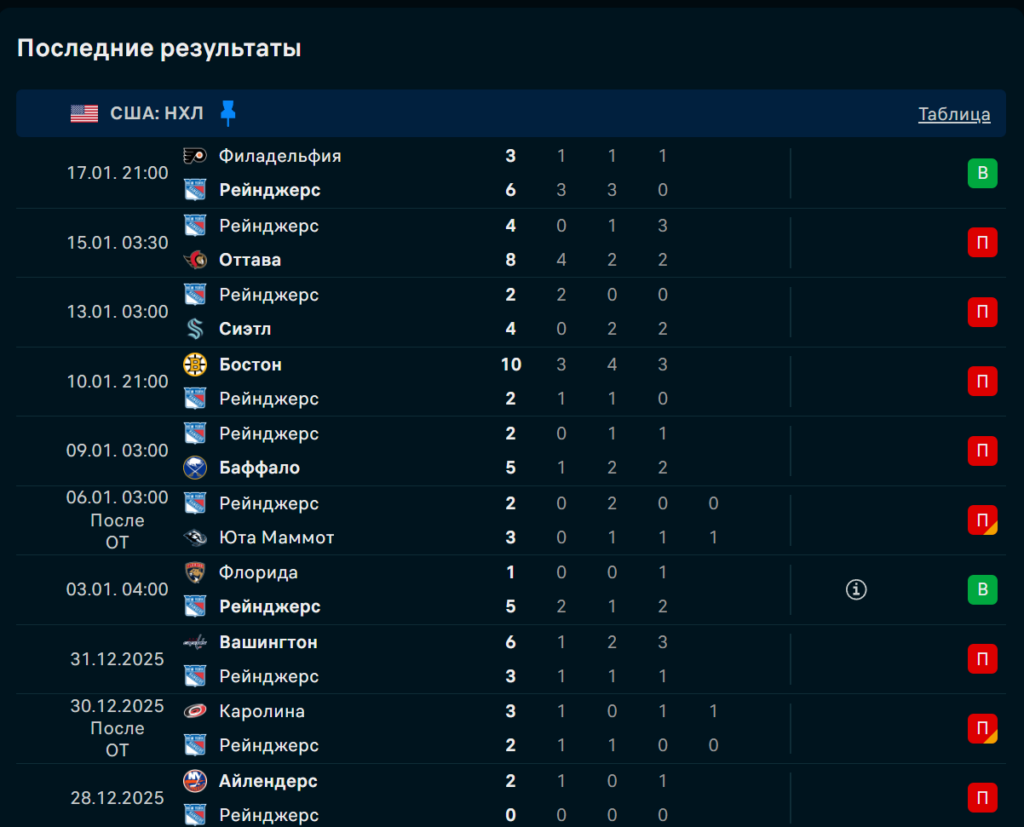 «Рейнджерс» переживают системный кризис: 124 заброшенные шайбы при 147 пропущенных. Потеря Шестеркина и Фокса ослабила оборону и большинство. Куик в воротах показывает 0,887 SV% — недостаточно для защиты. Команда проиграла 4 из 5 последних матчей, включая разгром от «Бостона» (2:10).