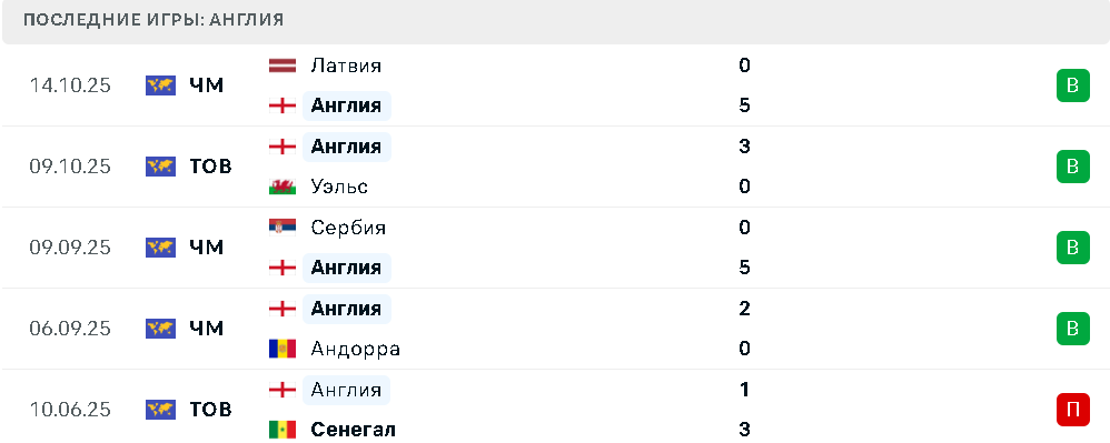 Единственное поражение английская команда потерпела в товарищеском матче против сборной Сенегала. После этого Англия не просто обыграла Андорру, Сербию и Латвию в квалификационных матчах, а Уэльс в товарищеском, но и не пропустила ни одного гола.