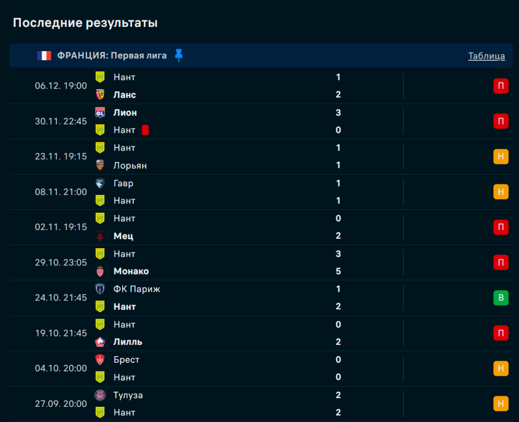 «Нант» проиграл «Лансу» (1:2), «Лиону» (0:3), сыграл вничью с «Лорьяном» (1:1) и «Гавром» (1:1), уступил «Мецу» (0:2). За последние 5 матчей — 0 побед, 2 ничьи, 3 поражения.