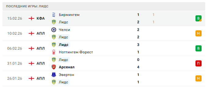 В последней игре, в 4-м раунде Кубка Англии, «Лидс» сыграл с «Бирмингемом» 1:1 и прошёл в следующий раунд по пенальти 4:2. В АПЛ последним матчем была ничья с «Челси» 2:2.