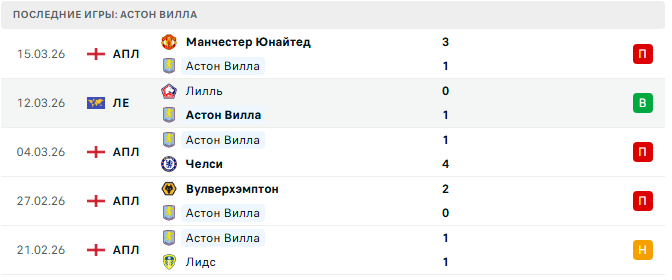 15.03.26 поражение от Манчестер Юнайтед 3:1 в гостях. В чемпионате три поражения подряд, зато в Лиге Европы — уверенная победа в Лилле 0:1. Домашние матчи в евротурнирах команда проваливает редко.