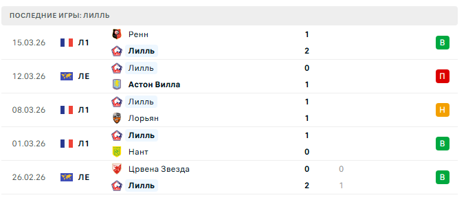 15.03.26 победа в гостях у Ренна 1:2. Серия в Лиге 1 неплохая, но домашняя ничья с Лорьяном 1:1 неделю назад выглядела тревожно. В Лиге Европы выезды даются сложно.