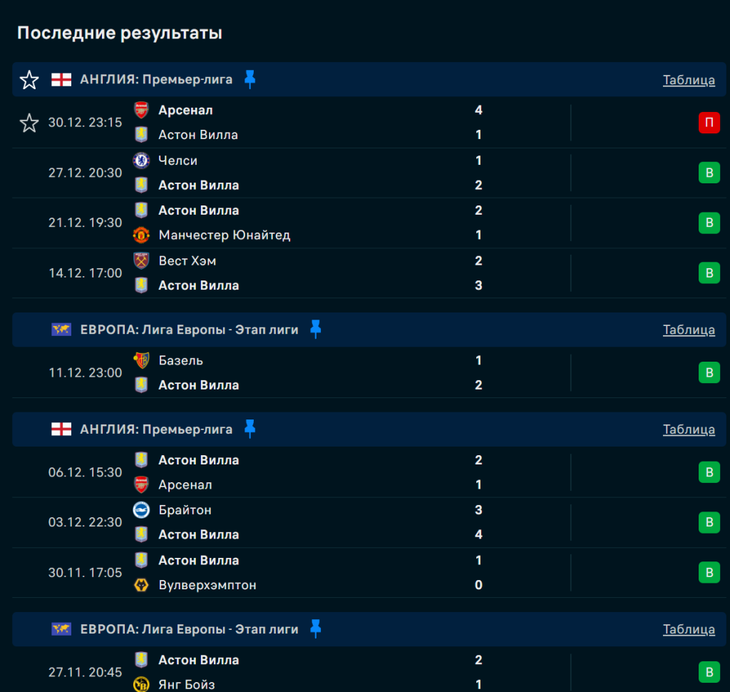 «Астон Вилла» обыграла «Челси» (1:2), «МЮ» (2:1), «Вест Хэм» (2:3), «Базель» (1:2) и уступила «Арсеналу» (1:4). В четырёх из пяти матчей проходил ТБ(2,5), в трёх — «Вилла» забивала минимум три гола. Даже в поражении от «Арсенала» команда создала опасные моменты, что говорит о стабильной атакующей активности.