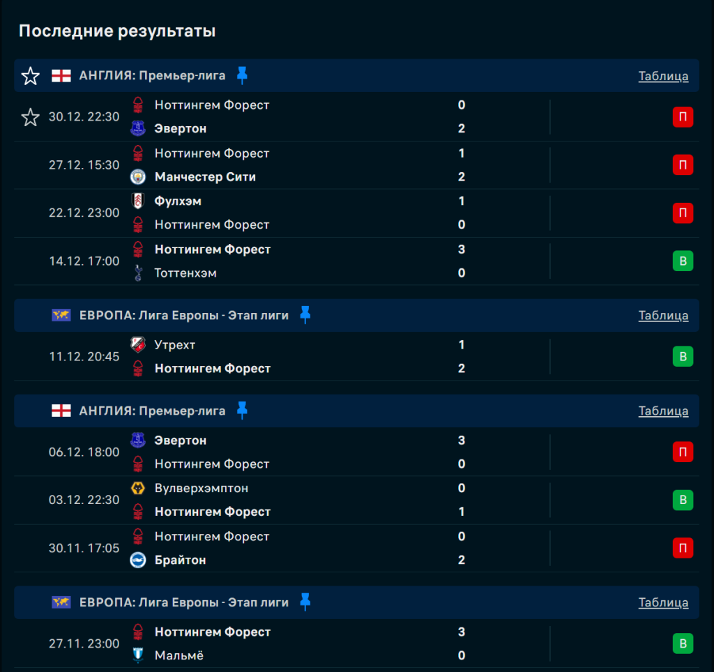 Последние пять очных матчей: три победы «Виллы», две — «Фореста». На «Villa Park» хозяева выиграли 4:2 (февраль 2024) и 2:1 (апрель 2025). В трёх из пяти встреч проходил ТБ(2,5), в четырёх — «Вилла» забивала минимум два гола. Исторически «Форест» редко уходит с поля без пропущенного мяча в Бирмингеме.