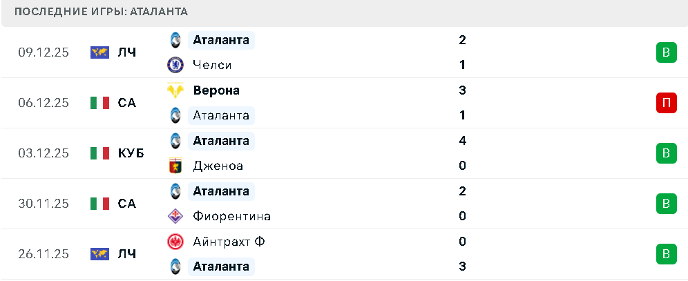 В пяти последних матчах во всех турнирах «Аталанта», тем не менее, одержала четыре победы — над «Айнтрахтом», «Фиорентиной», «Дженоа» и «Челси».