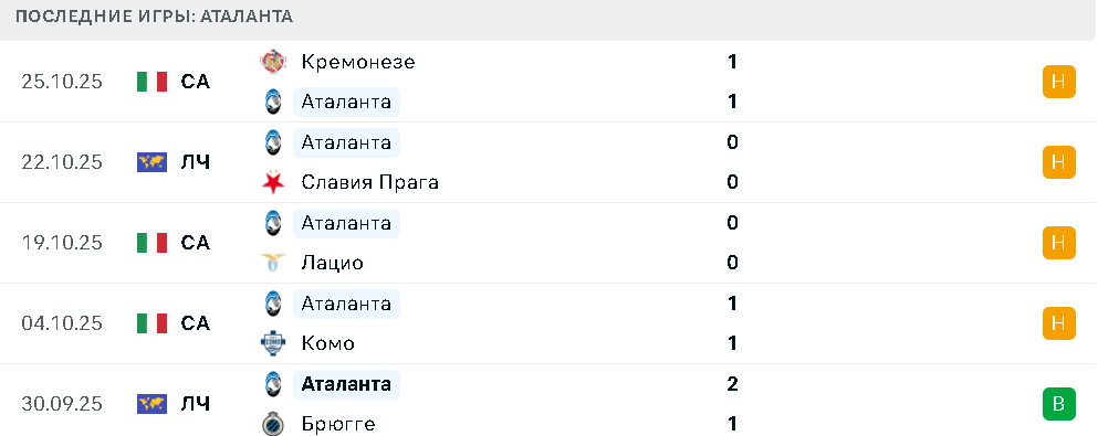 В пяти последних матчах в разных турнирах Аталанта одержала только одну победу над Брюгге. После этого команда сыграла вничью с Комо, Лацио, Славией и Кремонезе.