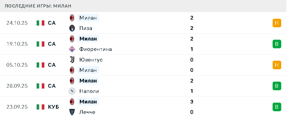 В пяти последних матчах в разных турнирах «россонери» одержали победы над Лечче, Наполи и Фиорентиной. Также были ничьи с Ювентусом и Пизой.
