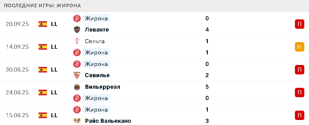 Жирона в пяти последних матчах сыграла вничью с Сельтой и потерпела поражения Райо Вальекано, Вильярреала, Севильи и Леванте.