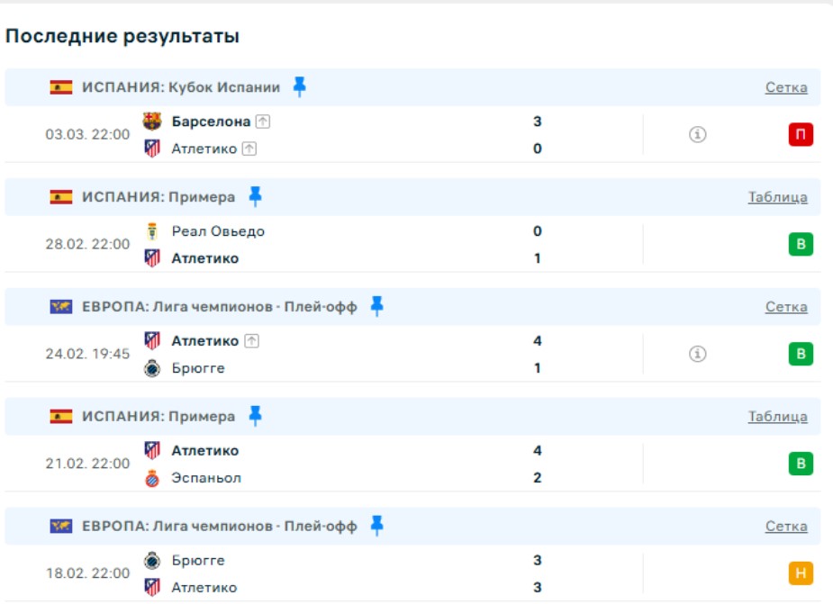 Последние игры Атлетико