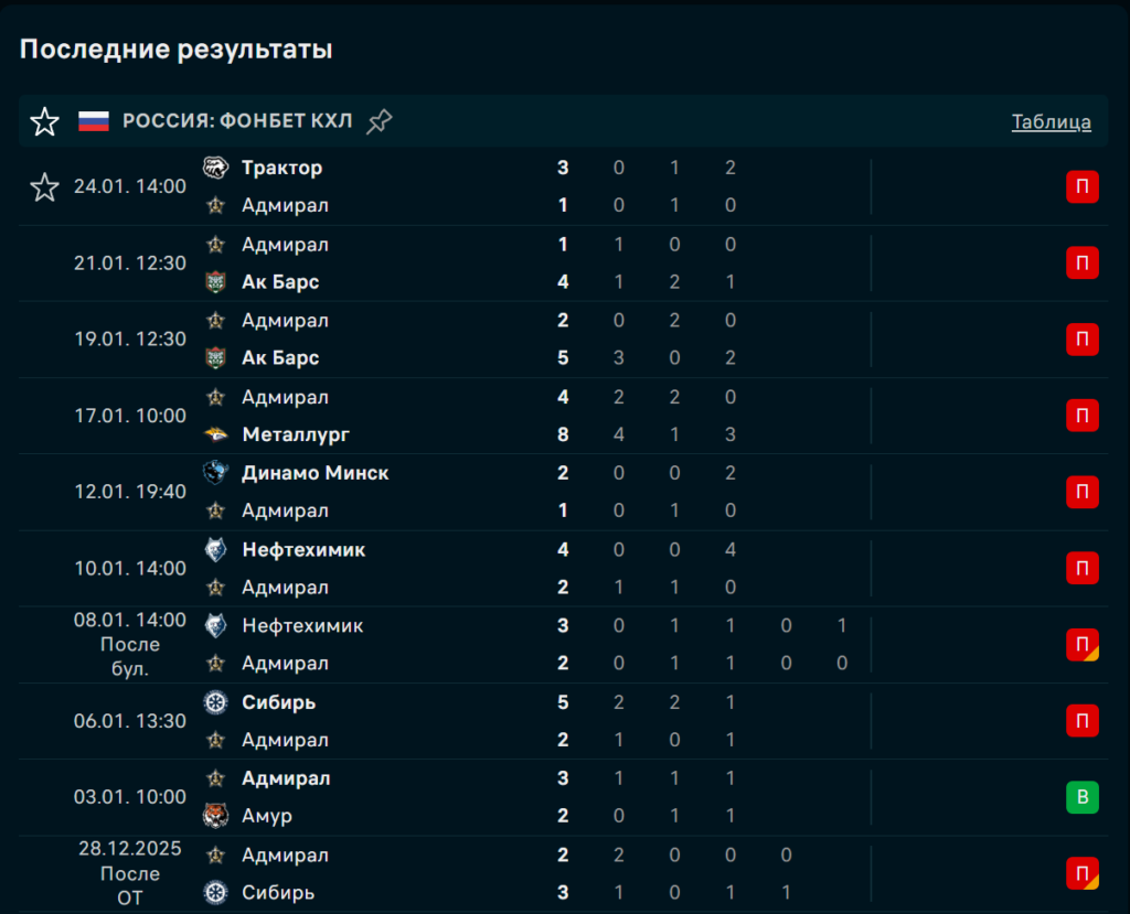 Серия из восьми поражений подряд включает катастрофические результаты: 1:4, 2:5, 4:8. Даже против «Трактора» (1:3) дальневосточники не смогли удержать счёт. Атака создаёт моменты, но не завершает их, а оборона регулярно проваливается при сменах. На выезде «Адмирал» не побеждает больше месяца.