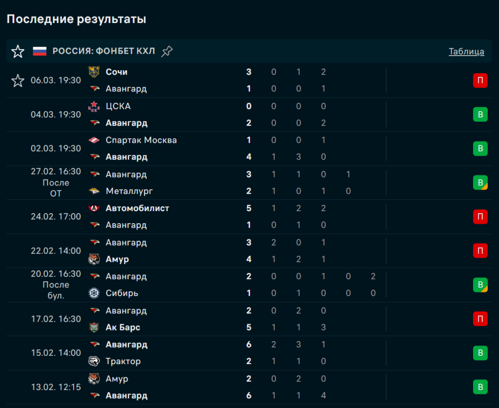 Последние игры Авангард Омск