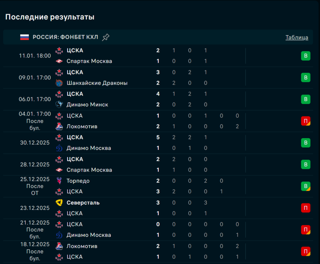 ЦСКА победил «Спартак» (2:1), «Шанхай» (3:2), «Динамо Минск» (4:2), уступил «Локомотиву» по буллитам (1:2), выиграл у «Динамо Москва» (5:1). Несмотря на победы, три из пяти матчей завершились с тоталом меньше 5,5. Гости предпочитают плотный, прагматичный хоккей.