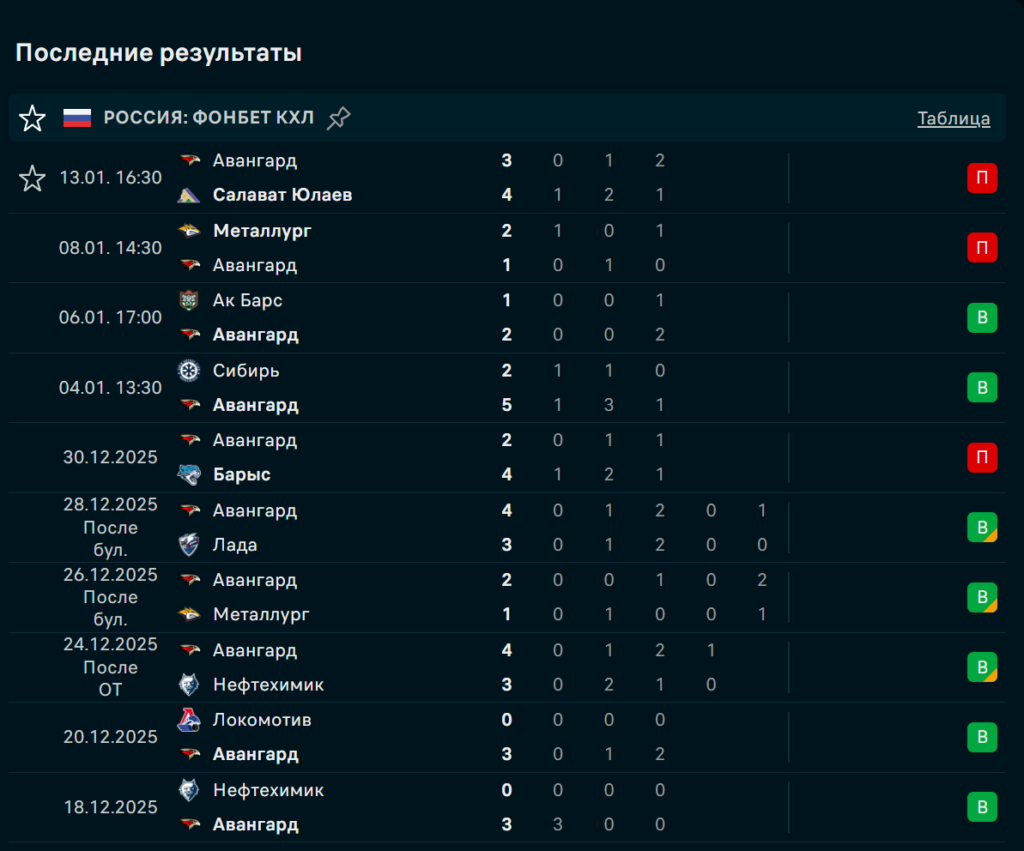 «Ястребы» демонстрируют одну из самых мощных атак лиги: 141 заброшенная шайба — 2-й показатель в КХЛ. Дома команда выиграла 6 из 8 последних матчей, забивая в среднем 3,4 шайбы за игру. Однако в двух из пяти последних встреч «Авангард» не смог забить более одной шайбы, что указывает на периодическую нестабильность в завершении. Отсутствие Волкова и Гуляева ослабляет глубину обороны, но основной состав остаётся боеспособным.