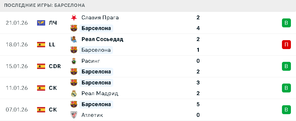 В пяти последних встречах «Барселона» одержала четыре победы, обыграв «Реал», «Атлетик», «Расинг» и «Славию». Единственное поражение пришлось на выездной матч против «Реал Сосьедада».