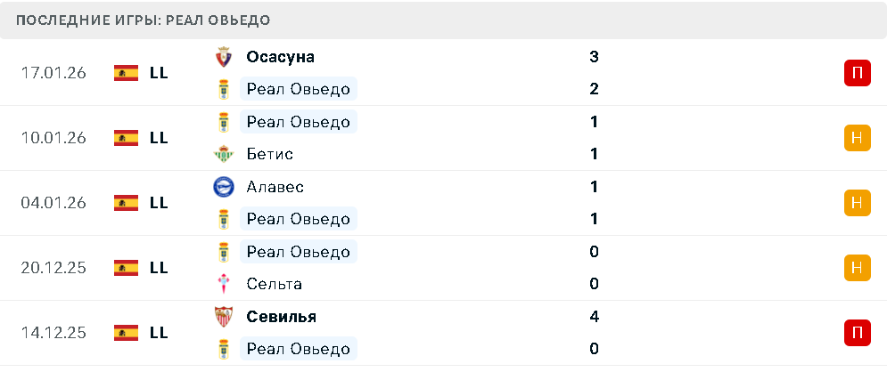 В пяти последних турах «Овьедо» не одержал ни одной победы: три ничьи и два поражения. Команда продолжает серию без выигрышей, которая насчитывает уже 14 матчей.