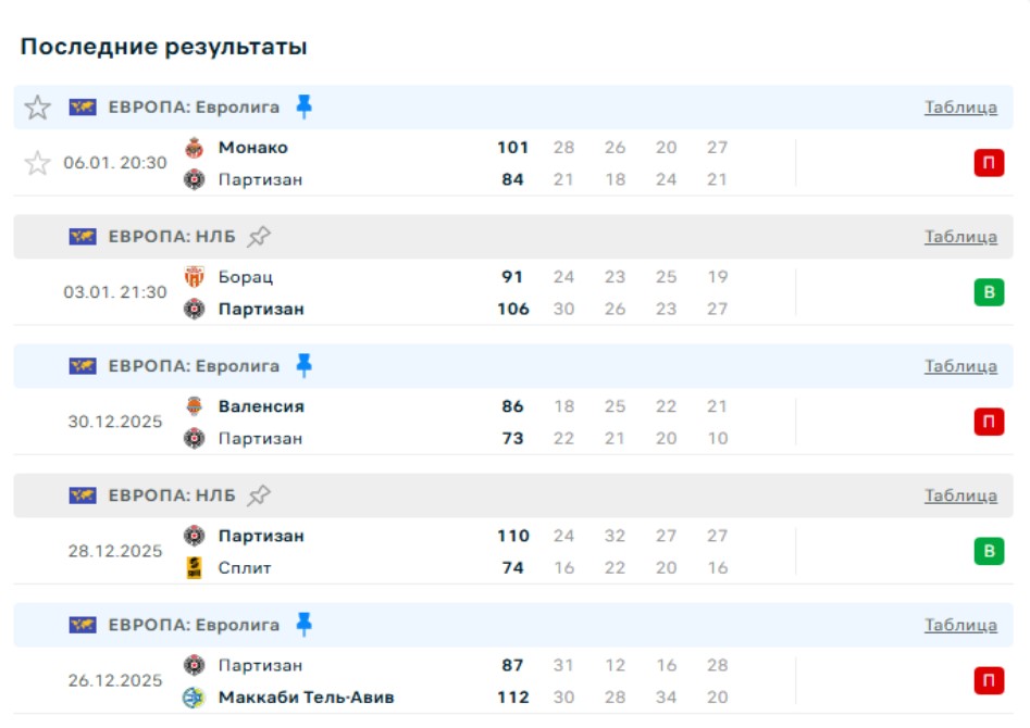 А вот в проходящей параллельно Адриатической лиге белградцы занимают второе место в группе А после Дубая. В прошлую субботу Партизан одержал очередную победу, выиграв в гостях у аутсайдера сербского Бораца 106:91.