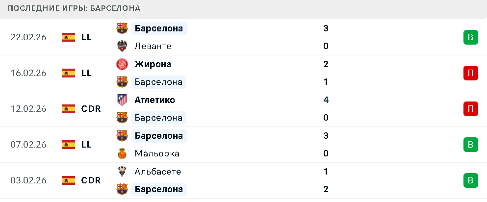 В пяти последних матчах «Барселона» потерпела два чувствительных поражения — от «Жироны» в чемпионате и от «Атлетико» в Кубке Испании. Однако в Ла Лиге команда уверенно разобралась с «Альбасете», «Мальоркой» и «Леванте», продемонстрировав высокую реализацию моментов и агрессивный прессинг. На своем поле сине-гранатовые традиционно действуют первым номером и задают темп с первых минут.