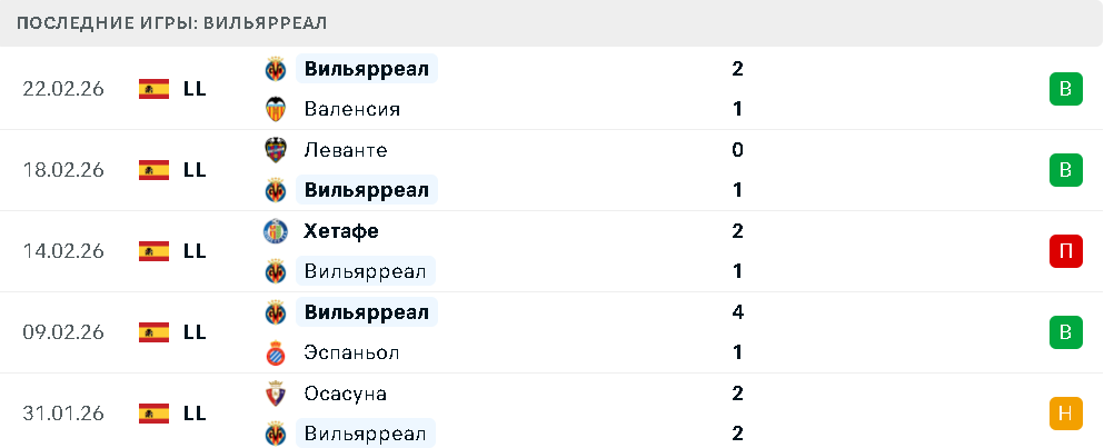«Вильярреал» в пяти последних встречах потерпел лишь одно поражение — от «Хетафе». Также была зафиксирована ничья с «Осасуной», а победы добыты в матчах против «Эспаньола», «Леванте» и «Валенсией». Команда демонстрирует организованный футбол и хорошую реализацию стандартных положений, однако в играх против лидеров часто допускает ошибки в обороне.