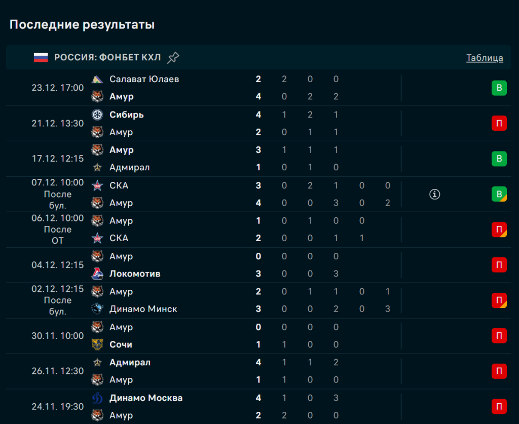 - Амур забивает минимум 2 шайбы в 4 из 5 последних матчей
