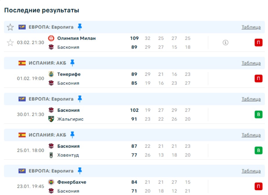 Из последних побед «Басконии» стоит выделить успех в матче против «Жальгириса». Литовцы уверенно идут в зоне плей-ин и сейчас соседи «Барселоны» в таблице. Обыграть команду из Каунаса 89:85 баскам удалось в предыдущем домашнем матче. До этого были повержены безнадежные аутсайдеры Евролиги — АСВЕЛ и «Анадолу Эфес».