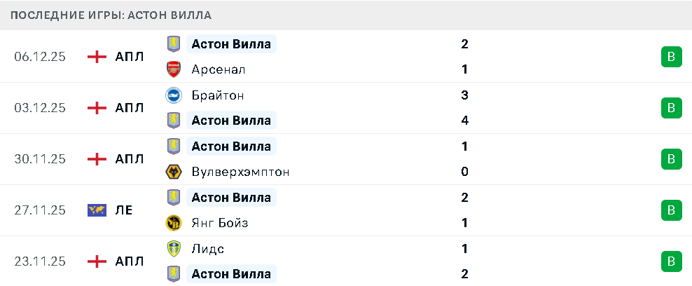 - «Астон Вилла» одержала 8 побед в 10 последних встречах.