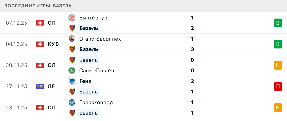 Поражение от «Генка» стало единственным для команды в пяти последних матчах. В остальных встречах «Базель» сыграл вничью с «Грассхоппером» и «Санкт-Галленом» и одержал победы над «Гранд-Саконне» и «Винтертуром».