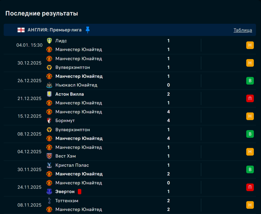 Последние игры Манчестер Юнайтед