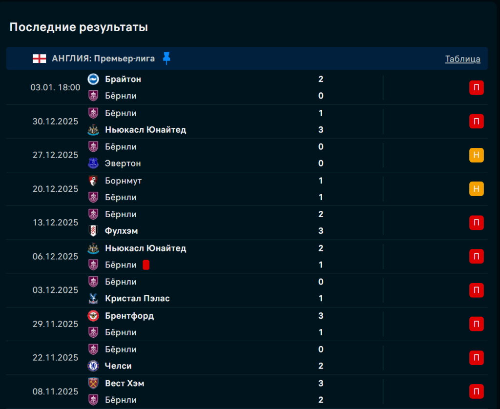 Последние игры Бернли