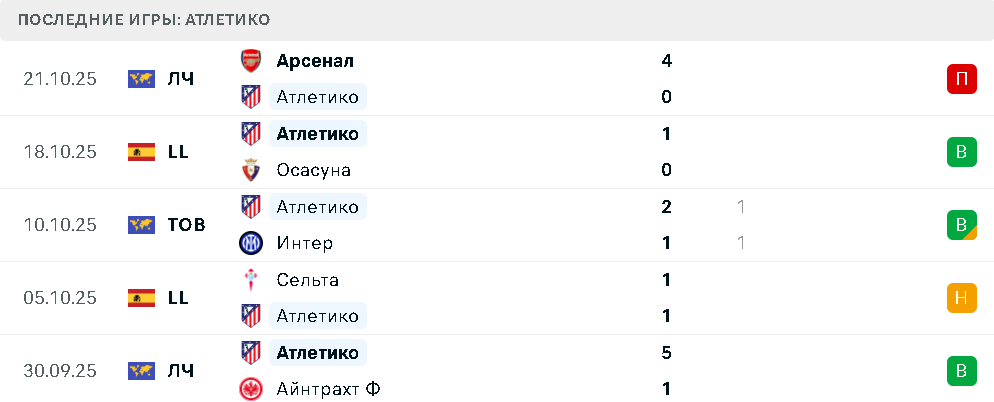 В пяти предыдущих матчах в разных турнирах Атлетико одержал победы над Айнтрахтом и Осасуной, сыграл вничью с Интером и Сельтой, а также потерпел разгромное поражение от Арсенала.