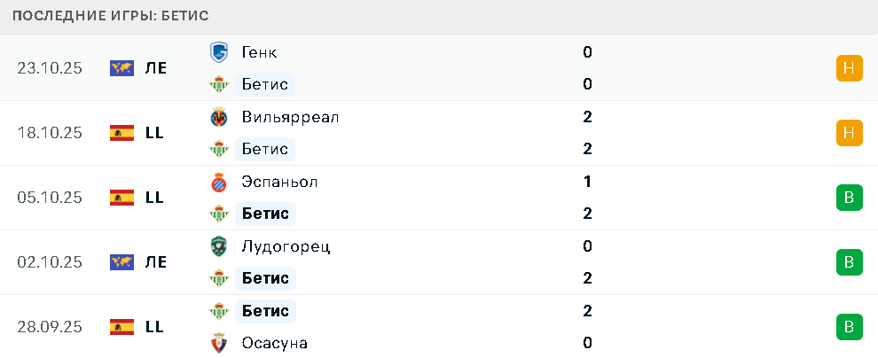 В пяти последних матчах в разных турнирах «бетикос» сначала одержали победы над Осасуной, Лудогорцем и Эспаньолом, после чего были ничьи с Вильярреалом и Генком.