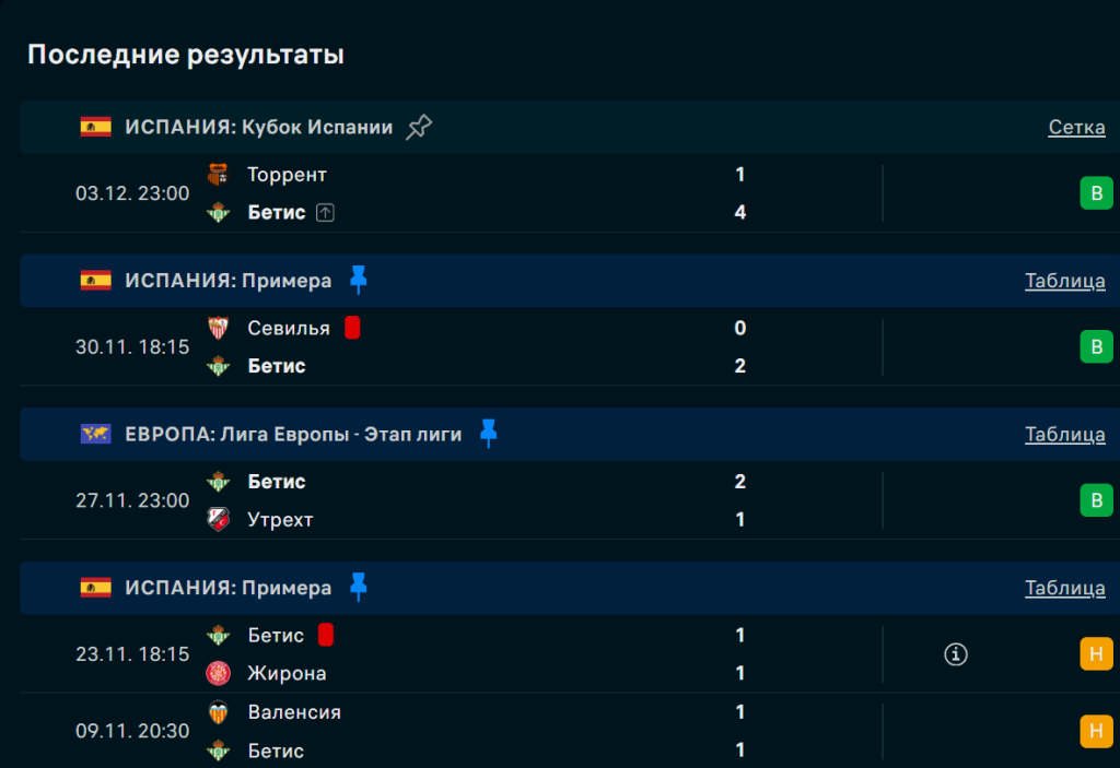 «Бетис» занимает 5-е место с 27 очками и демонстрирует стабильность: всего 2 поражения в 14 матчах. Команда Пеллегрини играет в открытый футбол, редко играет на ноль и забивает в 32 из 33 последних матчей лиги. Однако в матчах с топ-клубами «Бетис» уязвим: оба поражения в сезоне пришлись на домашние игры против «Атлетико» и «Атлетика».