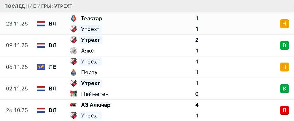 Единственное поражение в пяти последних матчах «Утрехт» потерпел в рамках национального первенства от клуба «АЗ Алкмаар». После этого команда чередовала победы над «Неймегеном» и «Аяксом» с ничьими с «Порту» и «Телстаром».