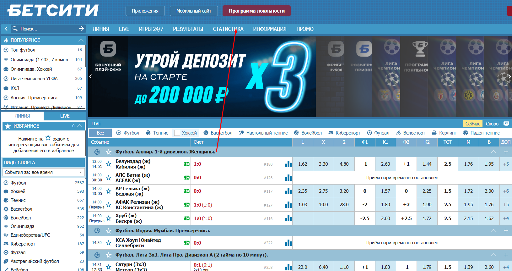 - Войти в раздел букмекерской конторы «Бетсити» («Статистика»).