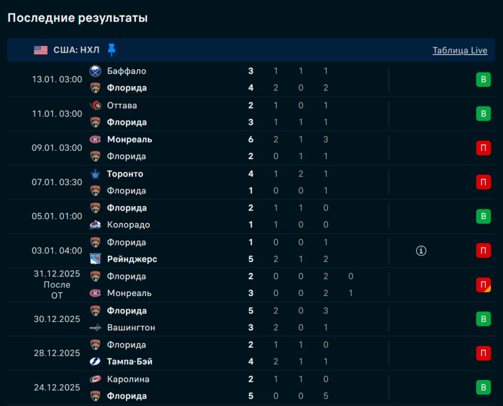 23 декабря 2025: «Флорида» — «Каролина» — 5:2, 19 декабря 2025: «Каролина» — «Флорида» — 3:4. В пяти последних очных встречах всегда проходил тотал больше 5,5. «Пантерс» выиграли последние две игры, но тогда в составе были Барков и Ткачук.