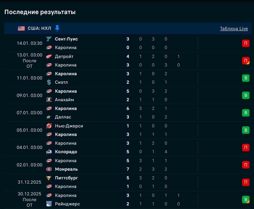 17 января, 03:00 МСК, PNC Arena, Роли. Регулярный чемпионат НХЛ, 48-й игровой день. «Каролина» занимает 2-е место на Востоке с 60 очками в 47 матчах, демонстрируя стабильность на домашнем льду (3 матча без поражений). Команда пропускает в среднем 2,8 шайбы за игру, но в последних двух встречах проиграла «Детройту» (3:4 ОТ) и «Сент-Луису» (0:3). «Флорида» идёт 12-й с 51 очком и борется за попадание в плей-офф. Гости выиграли три из пяти последних матчей, включая победы над «Баффало» (4:3) и «Оттавой» (3:2), но крупно проиграли «Монреалю» (2:6) и «Торонто» (1:4). В двух очных встречах в декабре «Пантерс» выиграли со счётом 4:3 и 5:2.