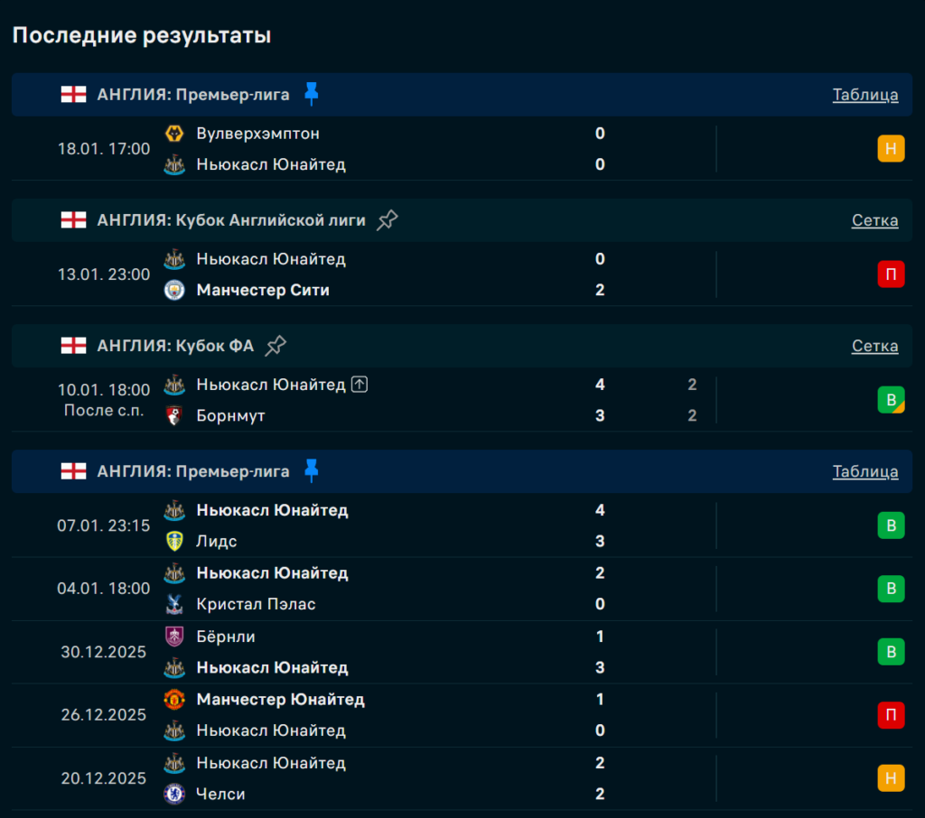 «Ньюкасл» сыграл вничью с «Вулверхэмптоном» (0:0), проиграл «Манчестер Сити» в Кубке лиги (0:2) и выиграл у «Борнмута» по пенальти (3:3). В ЛЧ — уверенные победы над «Бенфикой» и «Атлетиком». Команда сохраняет стабильность в атаке благодаря Гордону, забившему пять голов в шести матчах турнира.